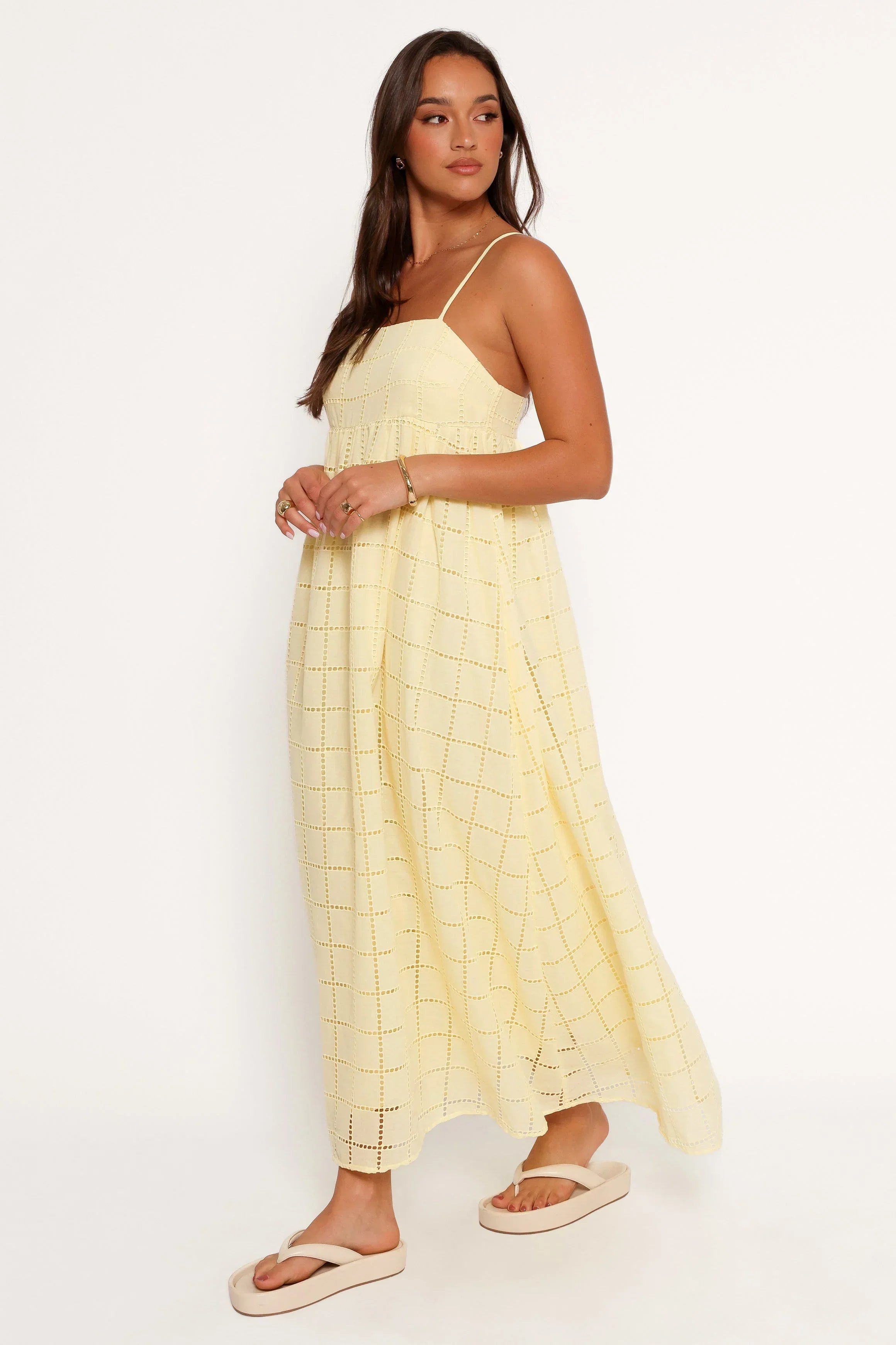 DETAILS Crafted from luxurious embroidery anglaise material, the Alyah Maxi Dress in Butter Yellow is designed to make you feel effortlessly chic. Its maxi length offers a graceful silhouette, perfect for both daytime outings and evenings out.