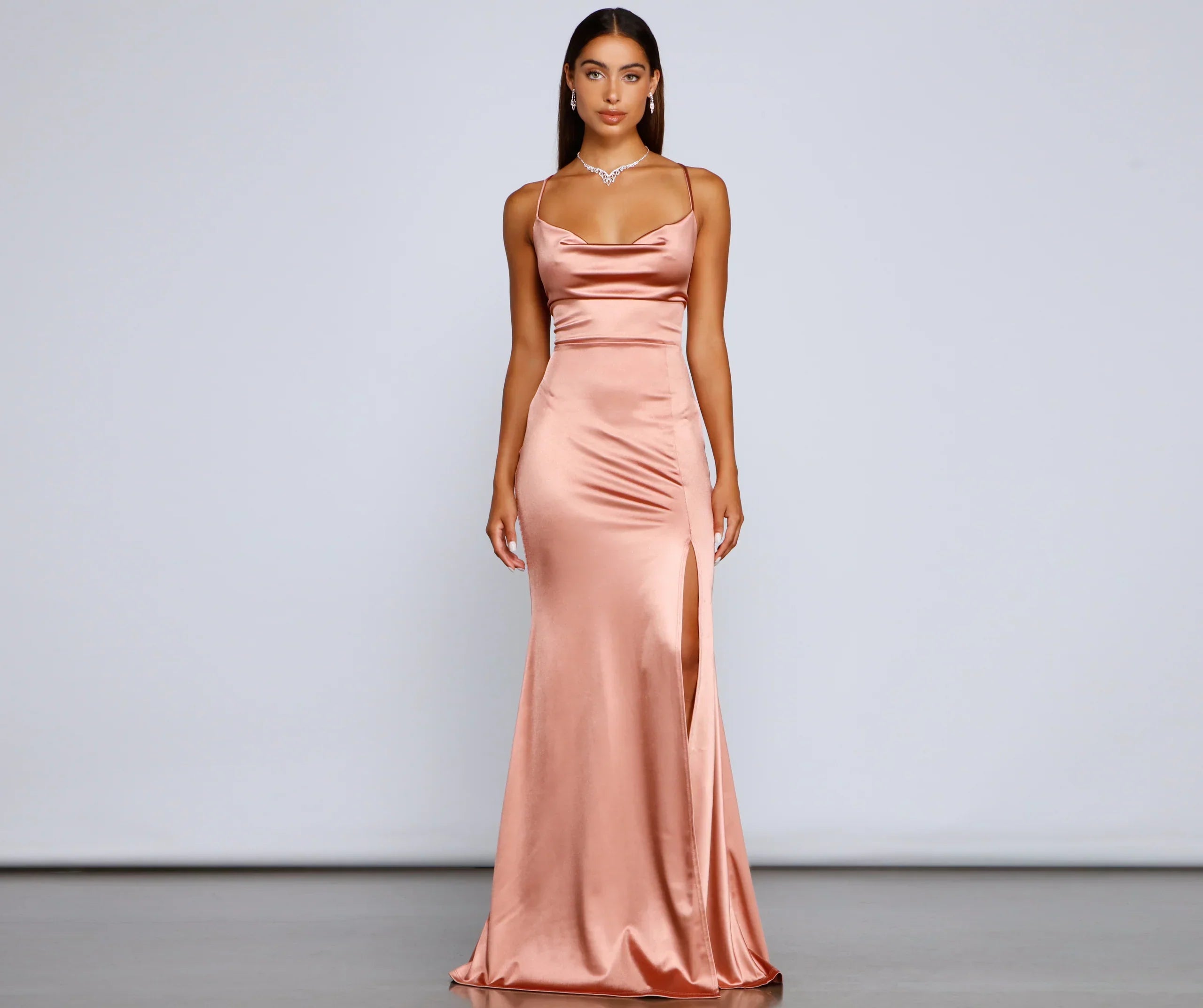 Make a head-turning entrance in a formal long dress that brings elegance! Bristol features a sleeveless cowl neckline, spaghetti straps that lead to a cross-back design, a lace-up back that lets you adjust the fit, a mermaid silhouette, and a high side slit for a display of leg. The lower back features a ruched detail that enhances curves. The long dress is composed of a satin stretch fabric that offers a form-hugging fit with a moderate stretch. Complete the look with and a clutch.