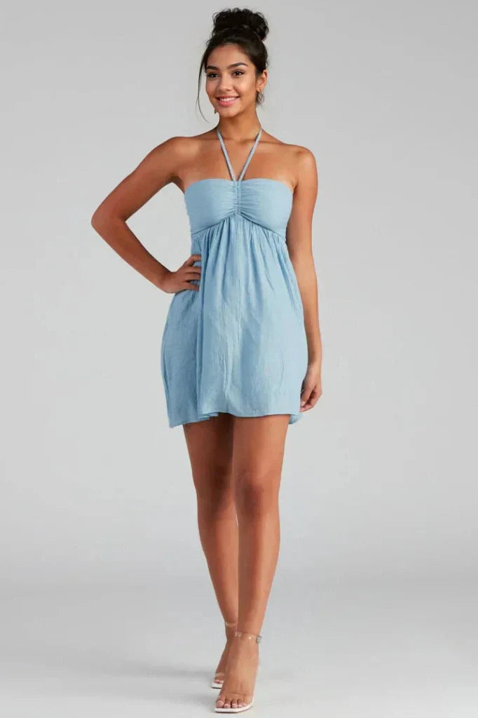 Bare your shoulders in this cute skater dress on a sunny day! Its easy, breezy design features a halter sweetheart neck, tie-back closure, a ruched bust, and a flowy silhouette and back zipper closure. Composed of seersucker woven fabric with an inner knit lining. Finish the look in lace-up sandals.