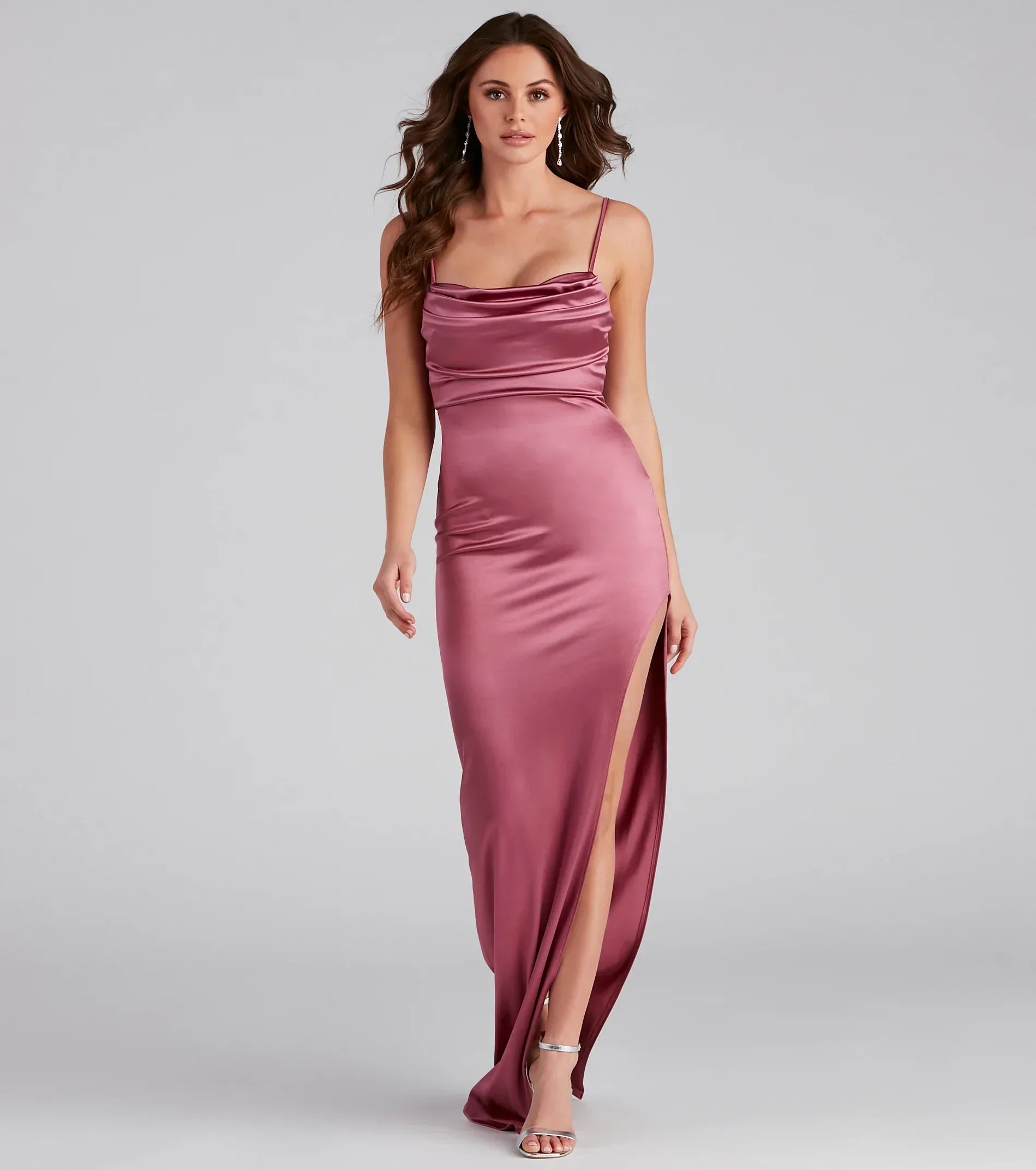 Make a stunning entrance at your next formal event in this long satin dress. This luxurious, floor-length satin dress features a cowl neckline, high side slit, and a slim-fit form-hugging silhouette. Perfect for weddings, black-tie events, or school dances.