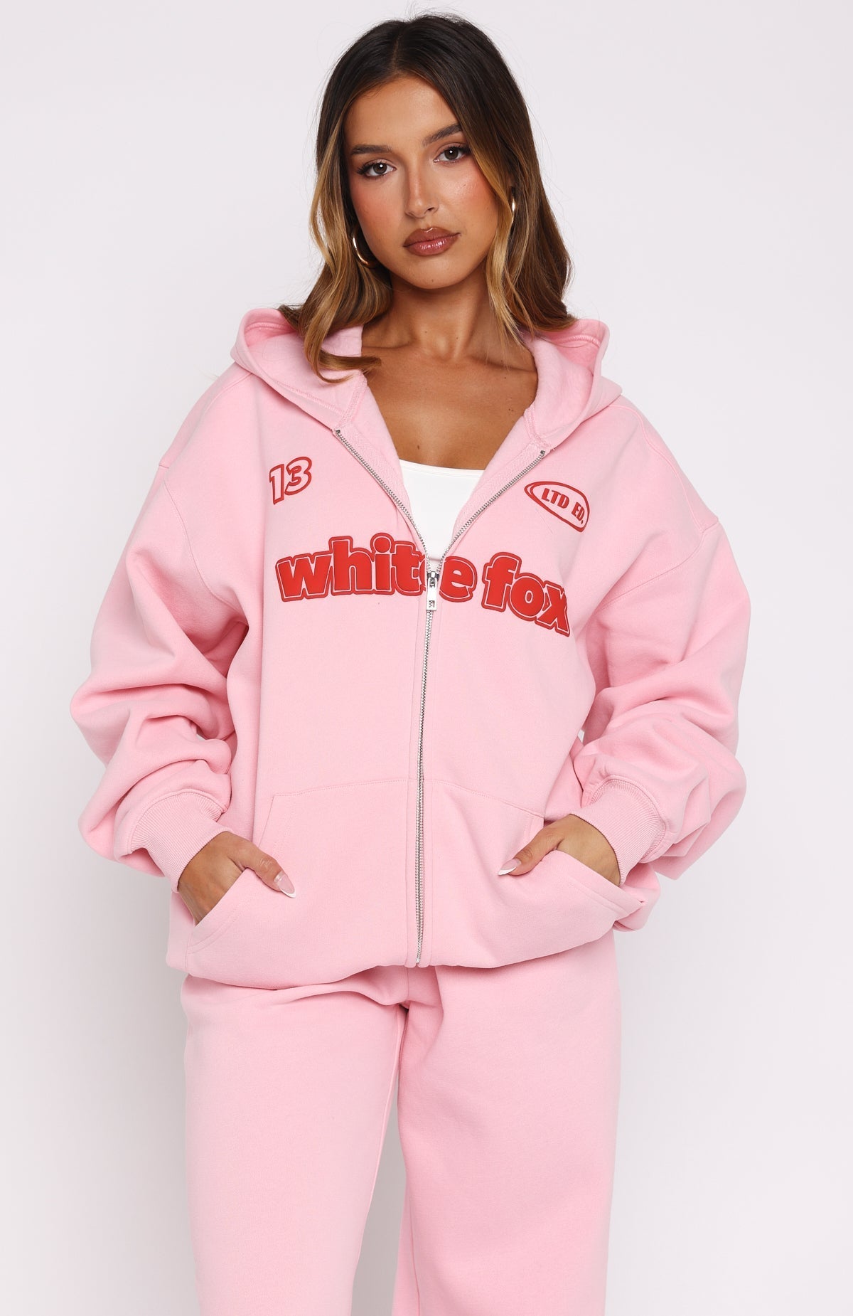 Indulge in the sporty aesthetic in the Ready To Go Zip Front Hoodie in Pink! Features a hood, zipper closure centre front, slouched shoulders, long sleeve with ribbed cuffs, two pockets, ribbed jumper hemline and signature puff print White Fox text and graphics centre front. Nail the matching set with the Ready To Go Wide Leg Sweatpants Pink.