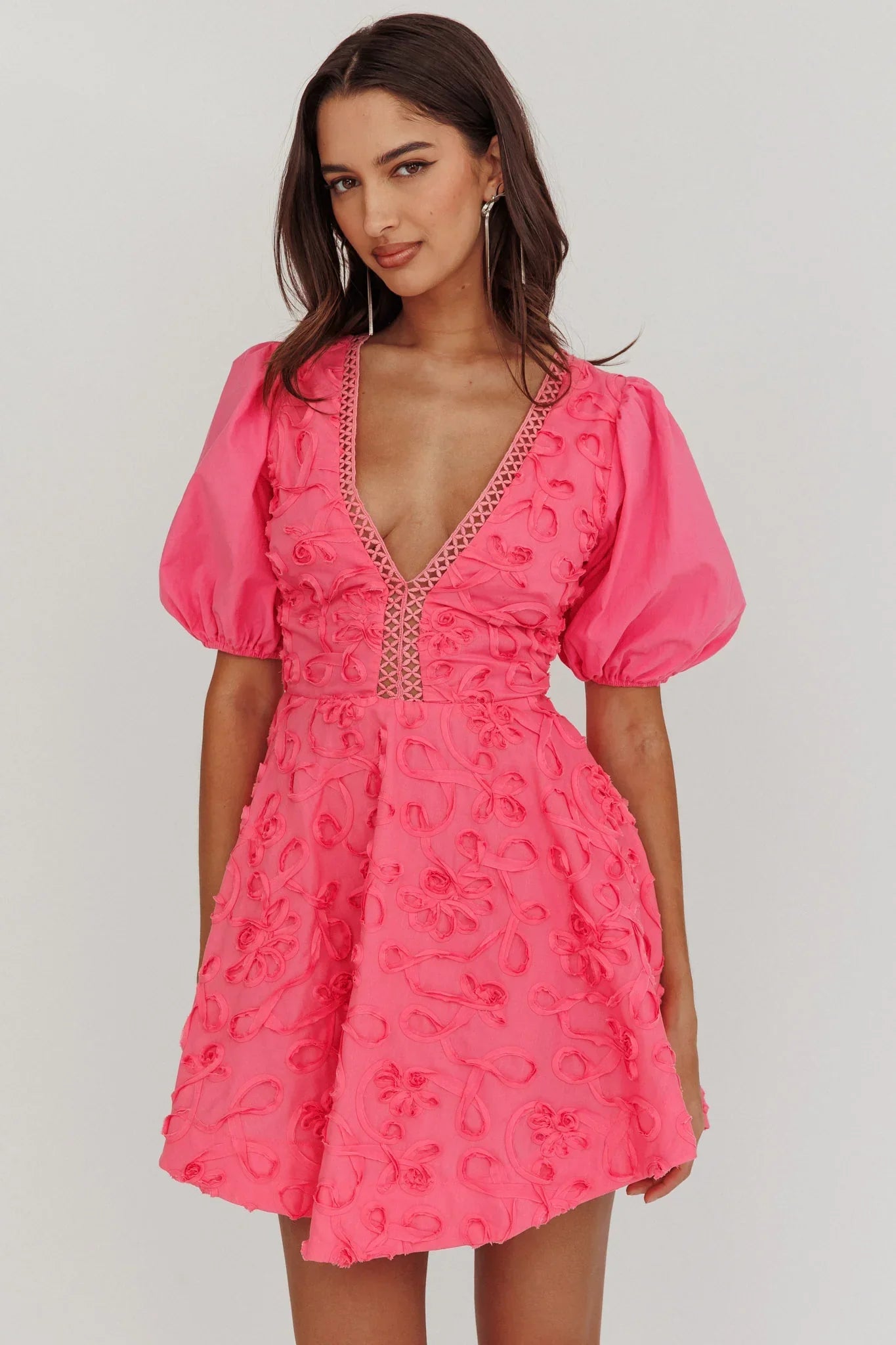 Make an entrance in our gorgeous Samsara mini dress. It features feminine puff sleeves and stunning floral embellishment throughout. It's perfect for a wedding or special occasion! Team it with nude, strappy heels and a clutch for an unforgettable look.